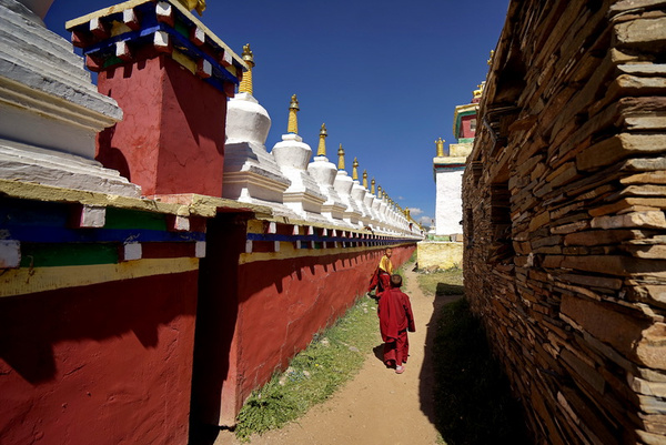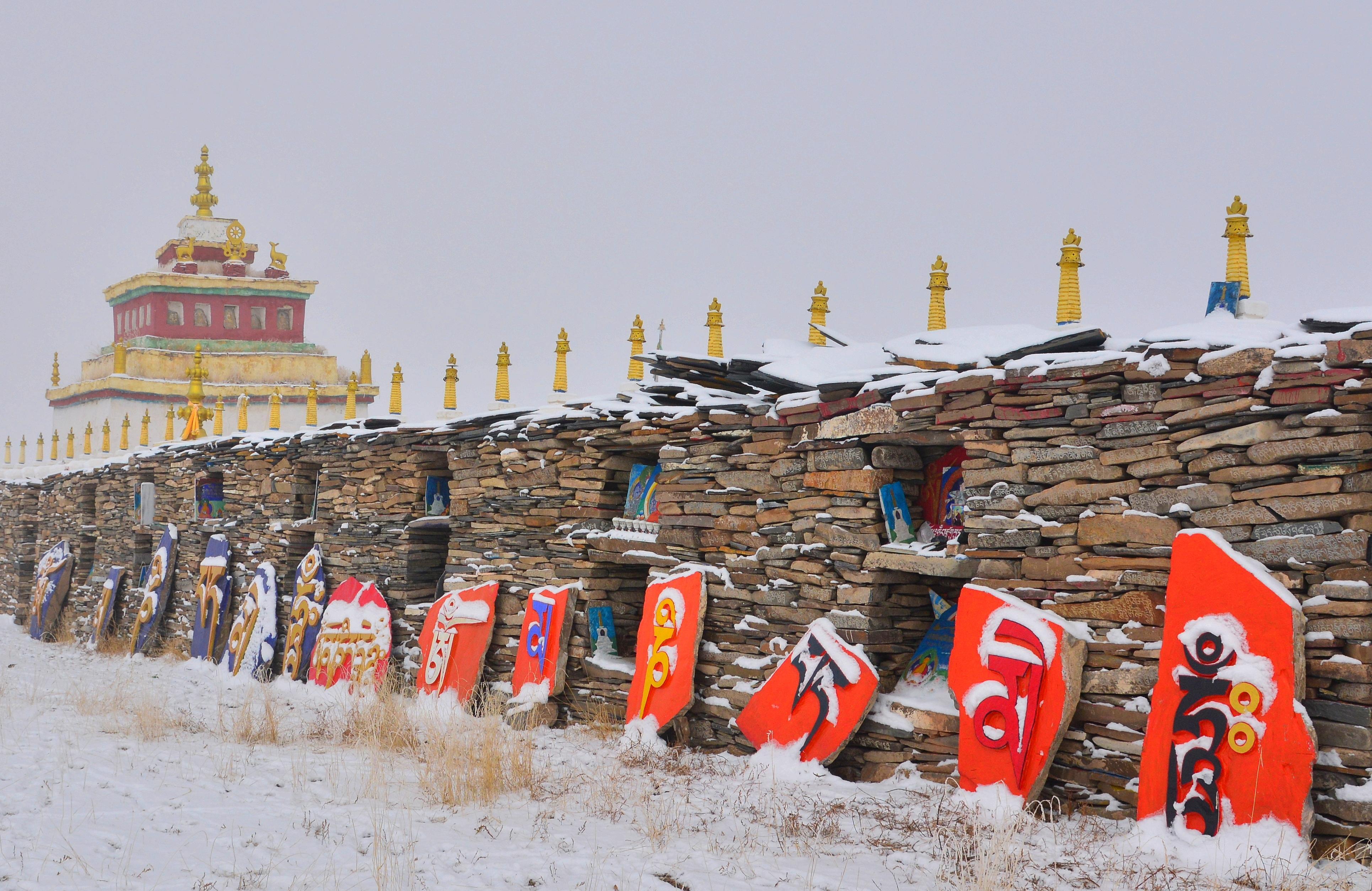 巴格嘛呢石经墙,信徒们在石上一锤一凿刻上经文,再一块块垒上去后逐渐形成的,目前藏区最长的玛尼墙。同当地的松格嘛呢石经城一样,巴格玛尼墙也是由一块块刻有佛经的石板堆砌而成。每一块石板上的内容都代表着当地人民内心最诚挚的祈愿。但较之松格嘛呢石经城不同的是,巴格嘛呢石经墙的外形是一道城墙,高达3米,厚约2—3米,长1.7公里,载入吉尼斯世界纪录改为国家级文物保护单位。从高处鸟瞰,巴格嘛呢石经墙宛若一座草原上的长城,气势恢宏又庄重古朴。